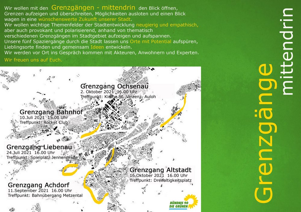 Wir wollen mit den Grenzgängen - mittendrin den Blick öffnen, Grenzen aufzeigen und überschreiten, Möglichkeiten ausloten und einen Blick wagen in eine wünschenswerte Zukunft unserer Stadt.