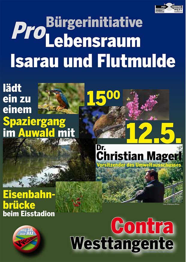Die Bürgerinitiative "Pro Lebensraum Isarau und Flutmulde – contra Westtangente" organisiert am 12. Mai einen Spaziergang durch den Auwald mit dem Vorsitzenden des Umweltausschusses des Bayerischen Landtags, Dr. Christian Magerl.