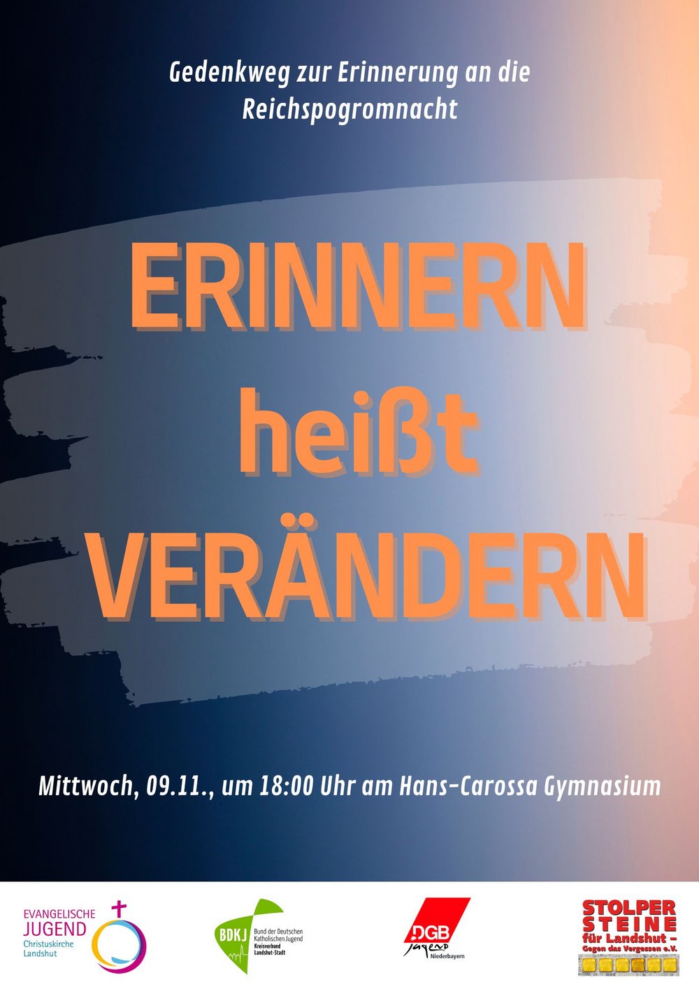 Die diesjährige Gedenkveranstaltung zum 9. November der Landshuter Jugendorganisationen wird dieses Mal von der Evangelischen Jugend organisiert. Unser Verein Stolpersteine tritt wieder als Mitveranstalter dieser Gedenkveranstaltung auf.