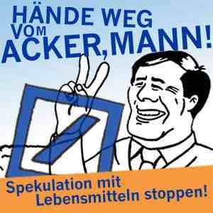 Auf der Seite von Foodwatch wird für eine Aktion geworben. Es geht darum, in einem ersten Schritt die Deutsche Bank dazu zu bewegen, keine Spekulationsgeschäfte mehr mit Nahrungsmitteln mehr einzugehen. Die Deutsche Bank hat sich auf Grund der Aktion auch schon zu einer Prüfung veranlasst gesehen. Also: Auf Foodwatch gehen und Aktion mitzeichnen!