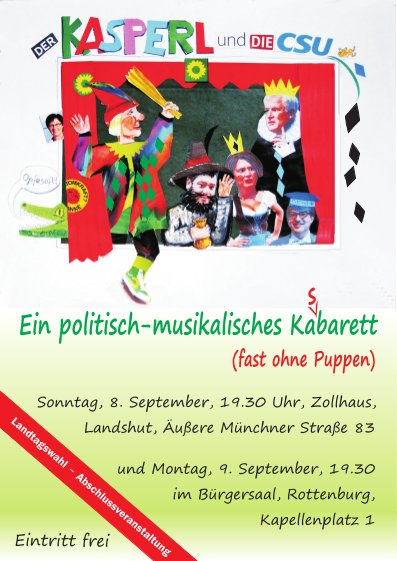 In unserem politisch-musikalischen Puppentheater müssen sich der Kasperl, der Seppel, die Gretel und die Großmutter gegen die durchtriebenen Mitglieder des CSU zur Wehr setzen. Werden Sie verhindern können, dass die schwarze Bande um den Ministerpräsidenten Seehunder und seinen willfährigen Schergen Doofrindt sich die Ideen der Grünen unter den Nagel reißt?