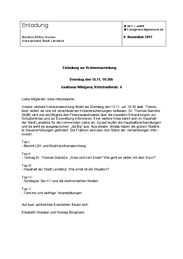 Unsere nächste Kreisversammlung findet am Dienstag den 15.11. um 19.30 statt. Thematisch wollen wir uns mit verschiedenen Krisenerscheinungen befassen. Dr. Thomas Gambke (MdB) wird uns als Mitglied des Finanzausschusses über die neuesten Entwicklungen zur Schuldenkrise und zur Eurorettung informieren. Eine weitere Krise bahnt sich im Haushalt der Stadt Landshut für die kommenden Jahre an. Zurzeit laufen die Haushaltsverhandlungen und da sieht es ausgesprochen „dürftig“ aus. Aus diesem Anlass haben die grünen Stadträte Steuererhöhungen gefordert. Die Fraktion wird über den Stand der Verhandlungen informieren.