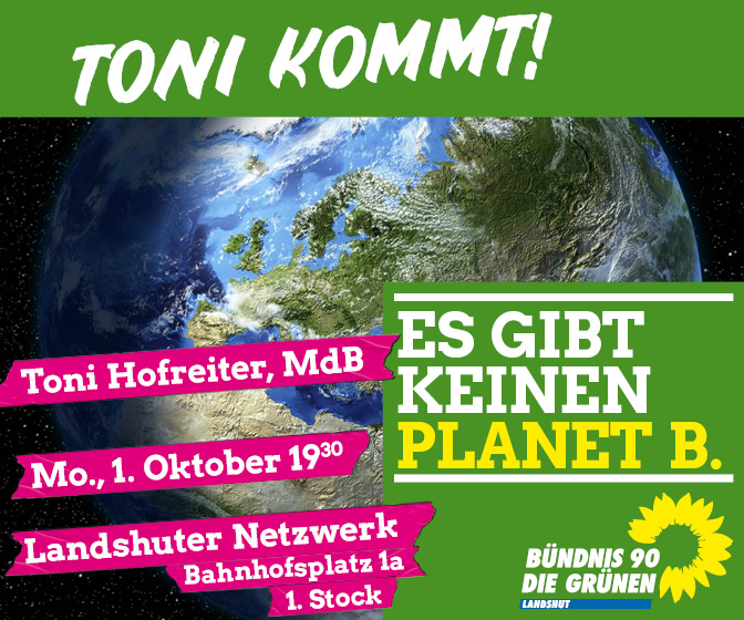 Auf Einladung der Landtagsabgeordneten Rosi Steinberger kommt am Montag den 1. Oktober Dr. Anton Hofreiter, Vorsitzender der Bundestagsfraktion der Grünen, zu einem Vortrag mit anschließender Diskussion nach Landshut.