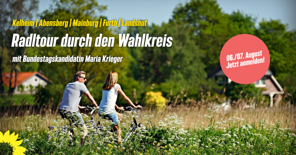 Ferienzeit ist Radlzeit. Am Freitag den 6. August startet unsere Direktkandidatin Maria Krieger mit ihrer Radltour durch den Wahlkreis Landshut-Kelheim. An zwei Wochenenden geht es von Kelheim im Norden bis nach Vilsbiburg im Süden. Maria will auf dieser Tour den Wahlkreis in seiner Vielfalt kennenlernen. Sie besucht interessante Projekte und trifft engagierte Menschen. Abends gibt es jeweils eine Gesprächsrunde zu aktuellen Themen. In Mainburg redet Maria Krieger mit MdL Uschi Sowa, baupolitische Sprecherin der Grünen Fraktion im Bayerischen Landtag zum Thema „Ökologisches Bauen“. In Vilsbiburg lautet das Thema „Wirtschaft mit Weitblick“.