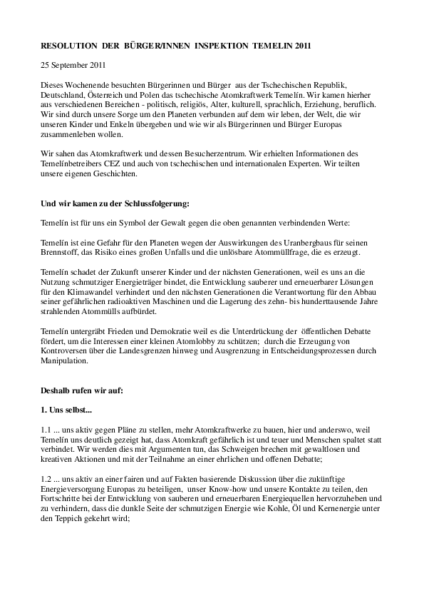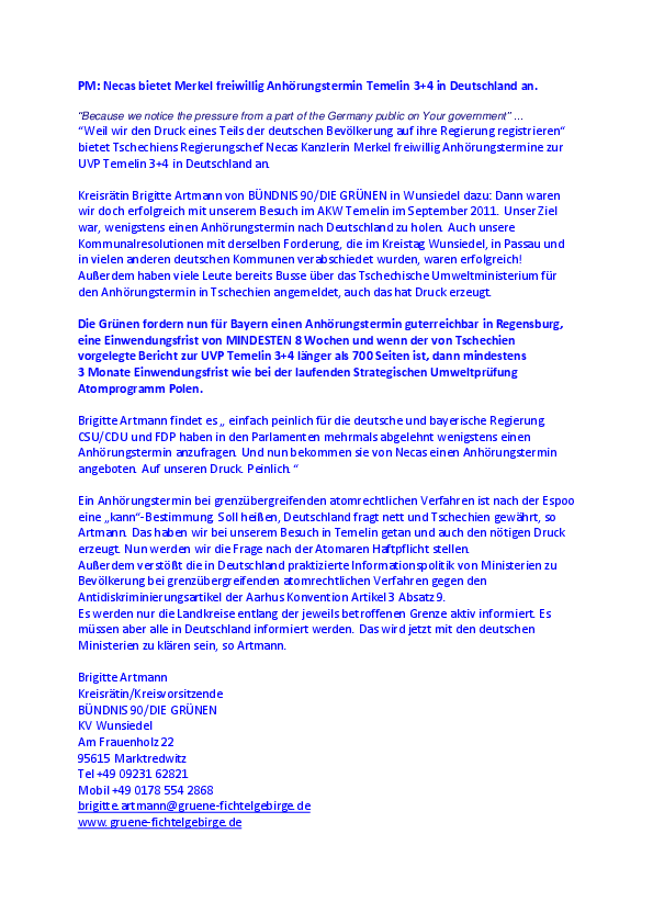 Kreisrätin Brigitte Artmann von BÜNDNIS 90/DIE GRÜNEN in Wunsiedel dazu: Dann waren wir doch erfolgreich mit unserem Besuch im AKW Temelin im September 2011. Unser Ziel war, wenigstens einen Anhörungstermin nach Deutschland zu holen. Auch unsere Kommunalresolutionen mit derselben Forderung, die im Kreistag Wunsiedel, in Passau und in vielen anderen deutschen Kommunen verabschiedet wurden, waren erfolgreich! Außerdem haben viele Leute bereits Busse über das Tschechische Umweltministerium für den Anhörungstermin in Tschechien angemeldet, auch das hat Druck erzeugt.