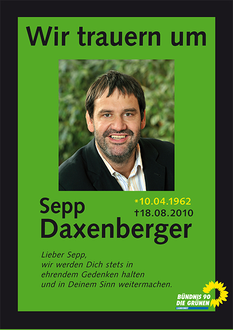 Sepp Daxenberger war ein großartiger Mensch: Gradlinig, offen, voller Humor und Optimismus. Er liebte seine bayerische Heimat und die Menschen. Er war ein nimmermüder Kämpfer für den Erhalt der Schöpfung und ein Streiter für die Demokratie. Als Politiker war er über alle Parteigrenzen hinweg hoch geachtet und geschätzt. Er starb nur wenige Tage nach dem Tod seiner Frau Gertraud. Unser ganzes Mitgefühl gilt seinen Kindern. Mit ihm verlieren wir einen guten Freund und hervorragenden Politiker. Sepp Daxenberger wird für uns unersetzbar bleiben. Er lebt in unseren Herzen weiter.