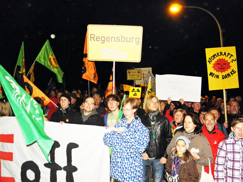 Die Mahnwache vor Isar 1 hat schon Tradition. Seit August 2010 treffen sich hier jede Woche mindestens hundert Demonstranten. Am gestrigen Montag waren es über 1000 Menschen, die angesichts der Katastrophe in Japan ein sofortiges Abschalten des Altreaktors Isar 1 forderten.