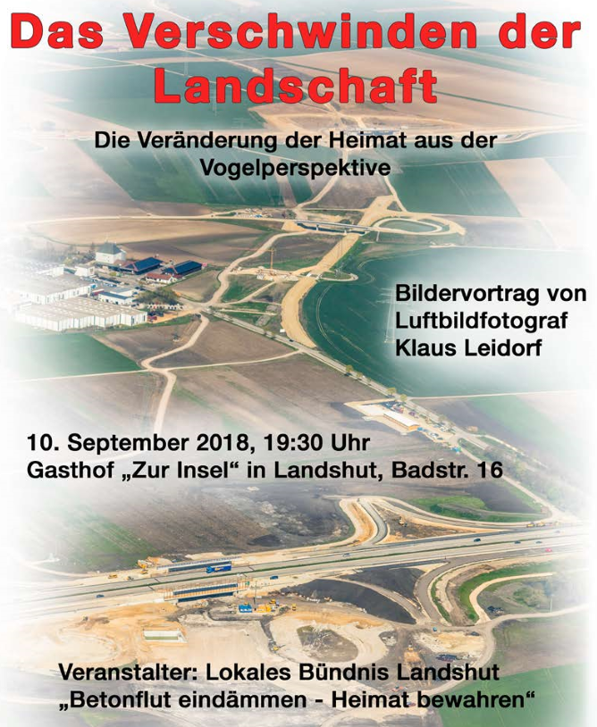 Das lokale Bündnis „Betonflut eindämmen – Bayerns Heimat bewahren“ lädt ein zu einem Bildervortrag mit Luftbildfotograf und Archäologe Klaus Leidorf am Montag, den 10. September im Gasthof „Zur Insel“. Mit seinen Aufnahmen aus der Luft gibt der Referent einen Einblick, wie sehr sich die Bayerische Heimat in den letzten Jahren verändert hat, wie Wiesen und Äcker verschwanden, Landschaft zersiedelt und zerschnitten wurde. Die Organisatoren wollen auch nach dem gerichtlichen Aus für das gleichnamige Volksbegehren für eine deutliche Verminderung des Flächenverbrauchs in Bayern kämpfen und sprechen sich für gesetzliche Änderungen aus, die Kommunen unabhängiger machen von der Ausweisung immer weiterer Gewerbeflächen, die wiederum weitere Verkehrsflächen benötigen. „Versiegelte Flächen können keine Ökosystemleistungen mehr erbringen z.B. als Versickerungsflächen und somit Flächen zur Grundwasserneubildung, als Flächen für den Anbau von Nahrung, als CO2- Senken, als Kühlung durch die Verdunstungskälte, die Pflanzen an heißen Tagen erzeugen, und nicht zuletzt als identitätsstiftende Landschaft, die Heimat ist und Lebensqualität, so die BUND-Naturschutz- Vorsitzende Kathy Mühlebach-Sturm als eine von drei Sprecher*innen des alten und neuen Bündnisses, dem die AbL, der LBV, der BN, der ADFC, der VCD, die BI Stopp B15 neu, Tagwerk, Bündnis 90/Die Grünen und die ÖDP, angehören.