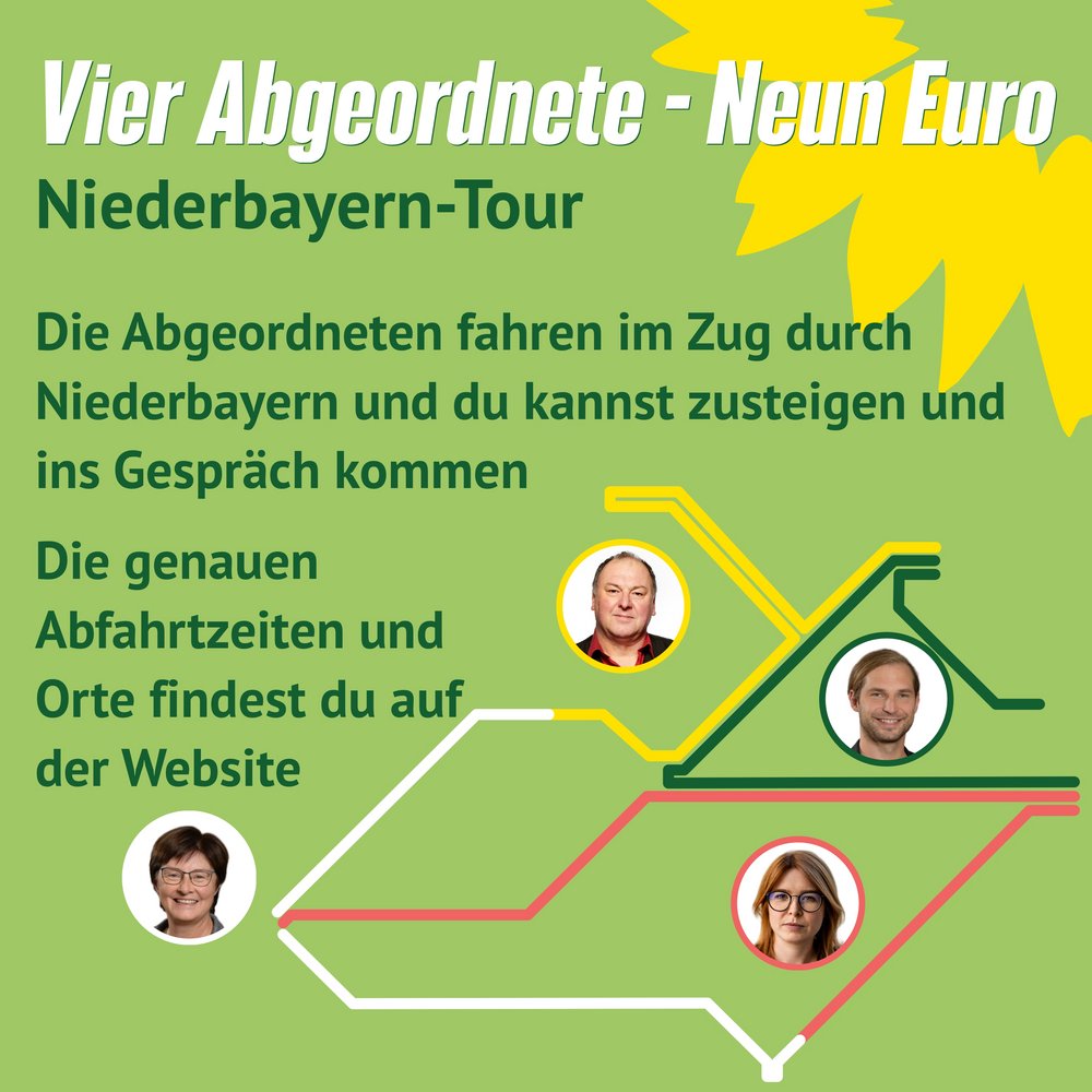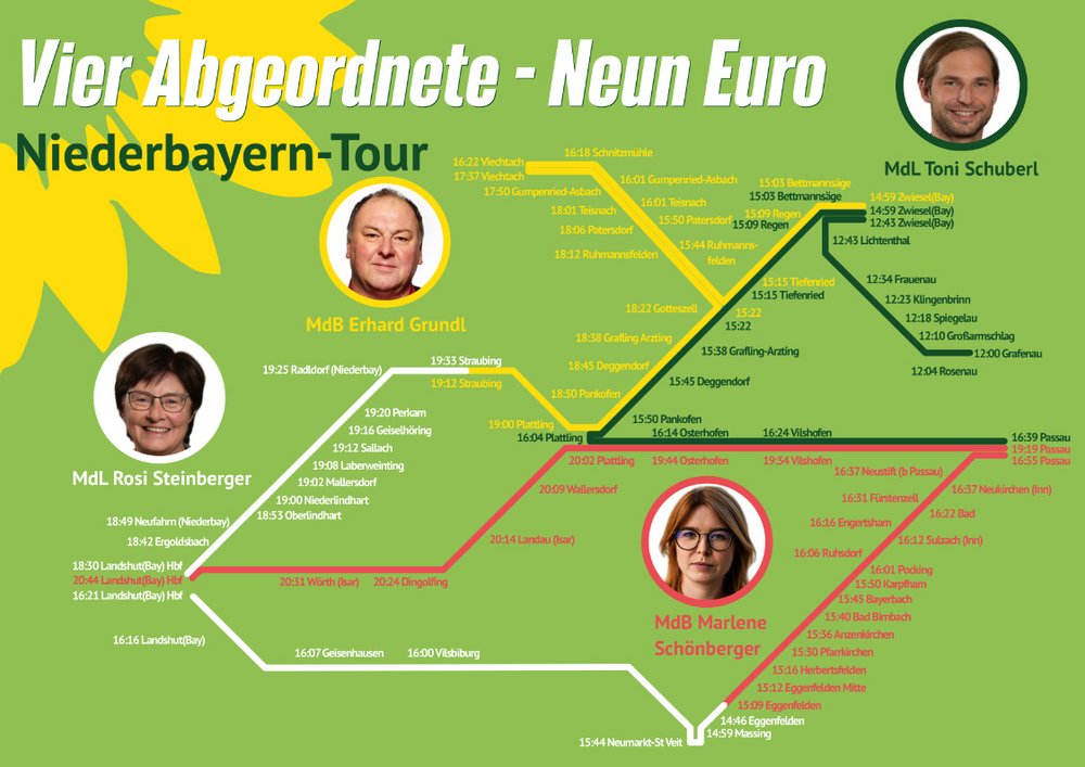 Zum Mitfahren und zu Gesprächen mit den Abgeordneten wird herzlich eingeladen. Alle Zwischenstopps finden sich auf der Website https://gruene-niederbayern.de/aktuelles.