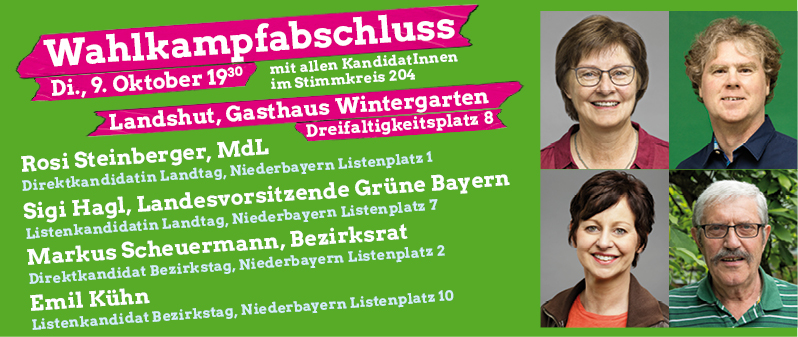 Nach aufregenden Wahlkampfwochen geben die Kandidat*innen einen Rückblick auf die Ereignisse der letzten Wochen, die Veranstaltungen, Infostände und Diskussionen, einen Überblick über Grüne Forderungen und einen Ausblick auf Grüne Ziele in Bayern und Niederbayern. Und der Abend ist Startschuss für den Endspurt.