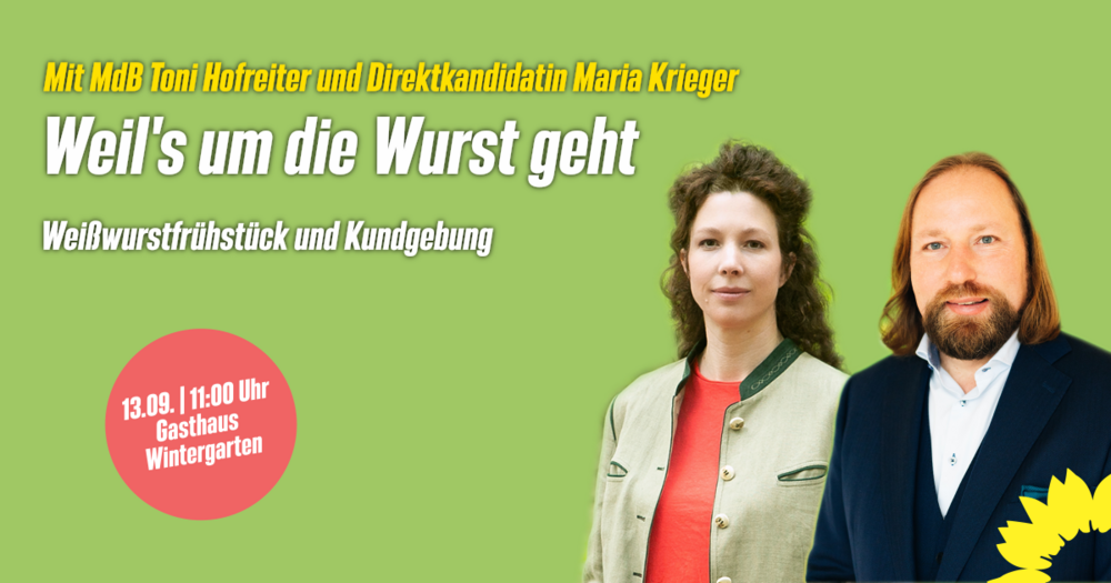 Die Landshuter Grünen starten in den Wahlkampfendspurt. Und weil es bei dieser Wahl um die Wurst geht, veranstalten sie am 13. September ein öffentliches Weißwurstfrühstück mit der Direktkandidatin Maria Krieger und Toni Hofreiter, dem Vorsitzenden der Grünen Fraktion im deutschen Bundestag. Der Ausgang der Wahl bleibt spannend und noch sind viele Wähler unentschieden. Hofreiter wird zu den größten Herausforderungen der zukünftigen Bundesregierung reden und die grünen Antworten darauf darstellen.