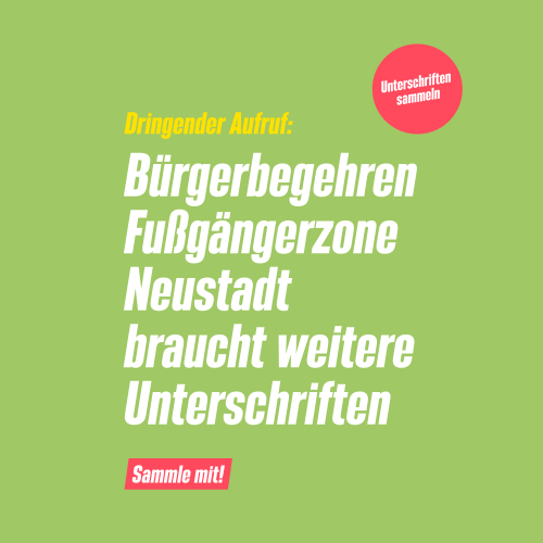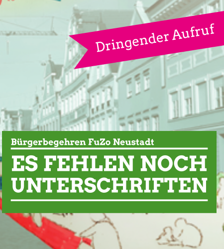 Bis zur Sitzung des Stadtrates am 27. Januar, auf der über die Zulässigkeit des Bürgerbegehrens entschieden wird, können Unterschriften nachgereicht werden. Macht mit und verhelft dem Bürgerbegehren zum Erfolg – damit die Neustadt zwischen Regierungsstraße/ Rosengasse und Bischof-Sailer-Platz zur Fußgängerzone wird. Wenn jede*r noch zwei Unterschriften bringt, dann haben wir es geschafft.