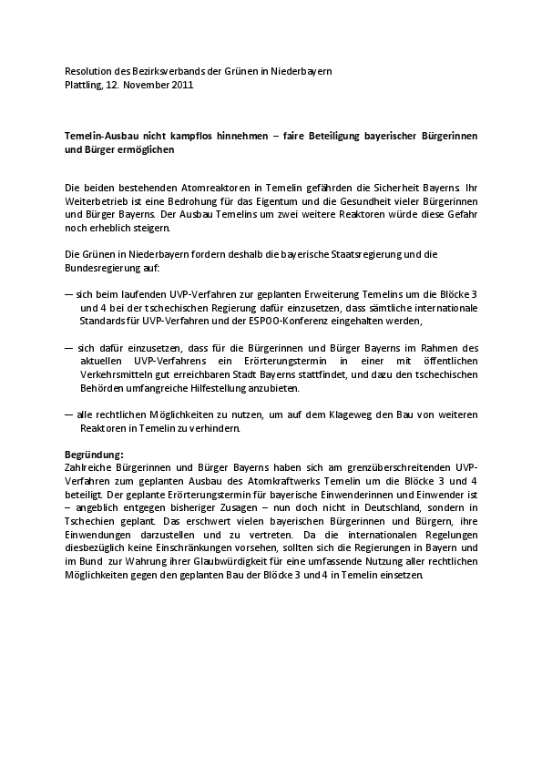 Zum Schluss verabschiedeten die Grünen noch eine Resolution gegen den Ausbau des tschechischen AKWs Temelin. Darin fordern sie die bayerische und die Bundesregierung auf, gegen den weiteren Ausbau von Temelin vorzugehen.